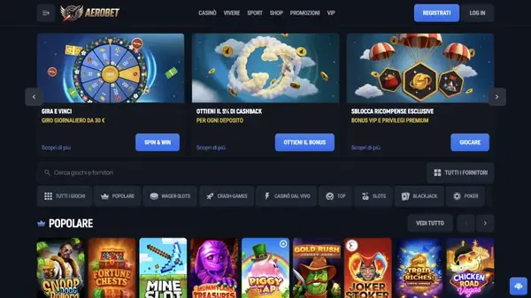 Aerobet Casino è la nostra piattaforma di casinò online, fondata nel 2025, pensata per i giocatori che vogliono tanti tipi di giochi in un unico posto e strumenti di gestione del conto semplici. Accogliamo gli utenti italiani con supporto EUR, opzioni di pagamento adatte al mercato locale e una libreria che arriva a circa 12.000 titoli. In casino Aerobet Italia, puoi passare da slot, tavoli dal vivo e giochi jackpot senza cambiare sito o portafoglio. Manteniamo anche le promozioni ben strutturate, con un pacchetto di benvenuto in quattro fasi e offerte separate per le scommesse sportive. Per gli utenti mobile, Aerobet funziona in modo fluido nel browser con la stessa cassa e gli stessi filtri di gioco che vedi su desktop.