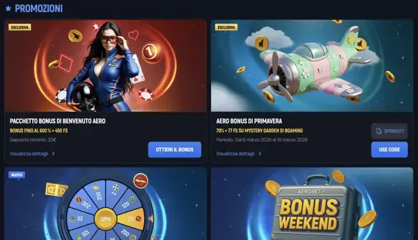 Organizziamo le offerte in modo che tu possa vedere rapidamente i requisiti di deposito e le regole di wagering prima di aderire. Troverai promozioni casino, campagne sportsbook ed eventi a premi nella stessa area. Se stai cercando un bonus senza deposito del casinò Aerobet, tieni presente che questo tipo di offerta non è indicato nelle nostre promozioni attuali per l’Italia.